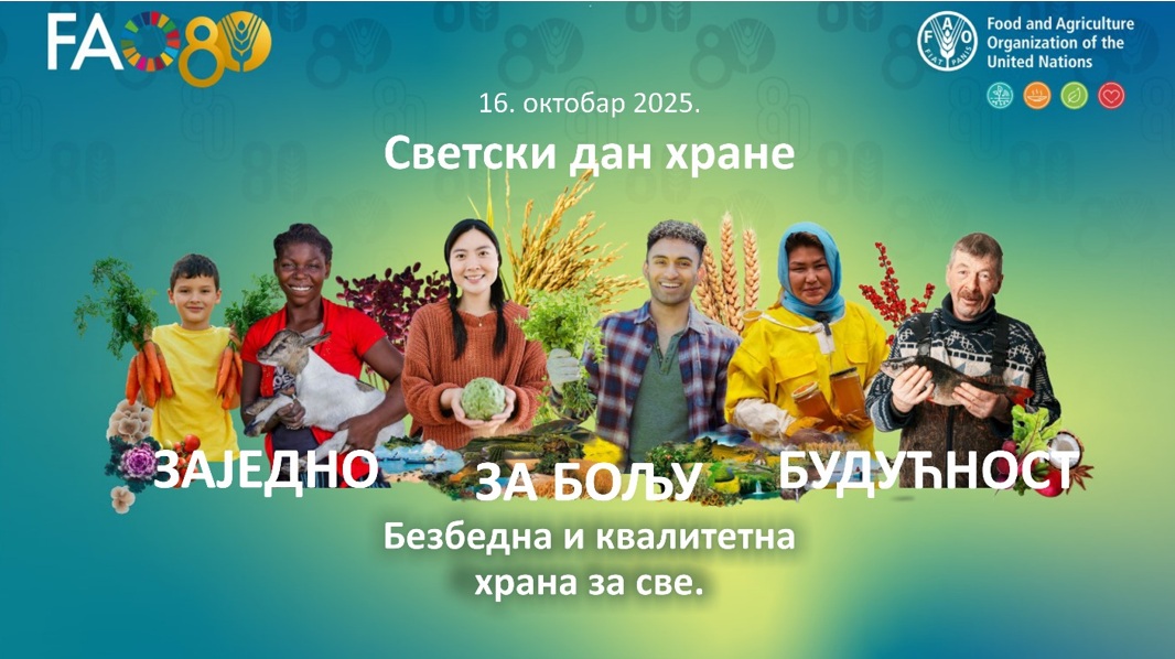 Organizacija za hranu i poljoprivredu (Food and Agriculture Organization, FAO) svake godine obeležava 16. oktobar – Svetski dan hrane, dan kada je ova organizacija i osnovana 1945. godine. U Srbiji se 16. oktobar – Svetski dan hrane obeležava od 2001. godine, uz podršku Ministarstva zdravlja Republike Srbije. Tema ovogodišnjeg Svetskog dana hrane je „Ruka u ruci za bolju hranu i bolju budućnost”.
